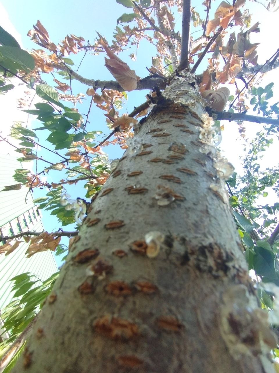 Если на стволе или ветвях появляются янтарные капли клейкой жидкости, это явление называется камедетечение (гоммоз).